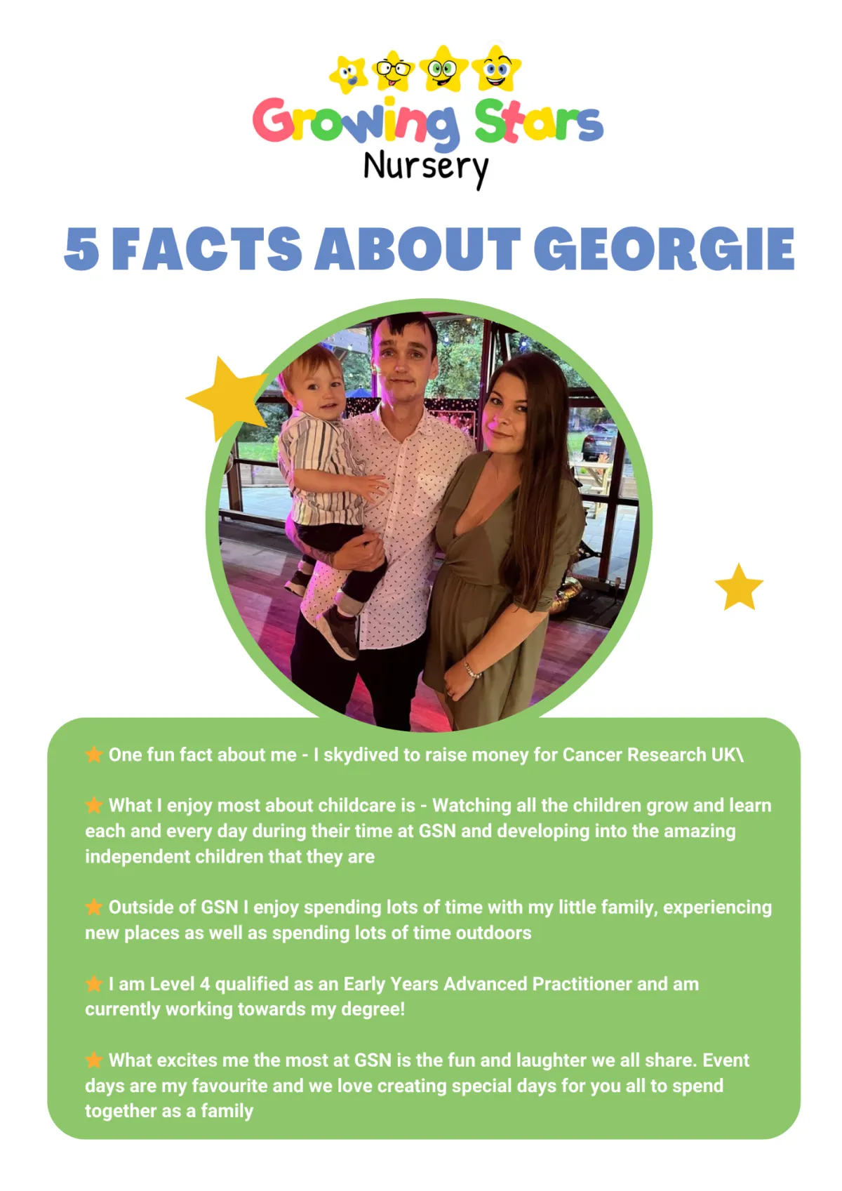 Our team members are incredible care providers, educators and role models at Growing Stars Nursery. We are committed in providing your child a positive environment in which they can safely explore their natural curiosity to learn.